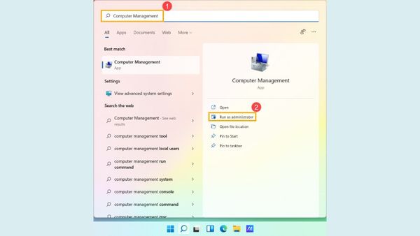 Bước 1: Tại thanh tìm kiếm, nhập Computer Management, rồi chọn Run as Administrator.