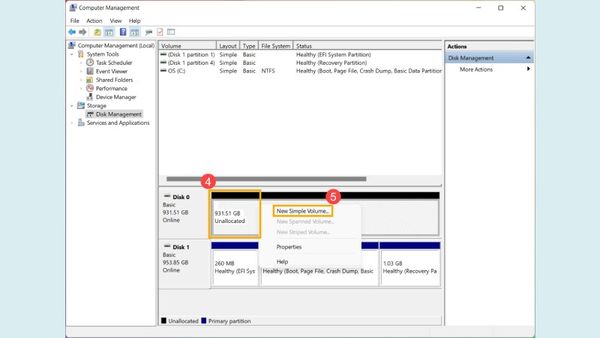 Bước 3: Nhấn chuột phải vào vùng chưa được phân bổ trên ổ cứng, sau đó chọn New Simple Volume.