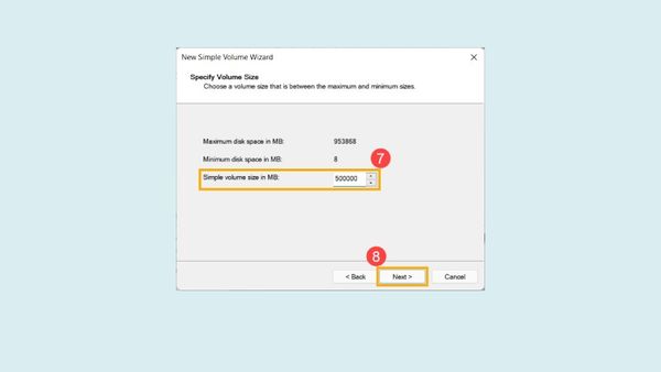 Bước 5: Nhập Volume Size mà bạn muốn tạo, sau đó chọn Next. Lưu ý rằng nếu kích thước của ổ đĩa mà bạn muốn tạo không đạt kích thước mặc định tối đa thì phần dung lượng còn lại vẫn là vùng chưa được phân bổ.