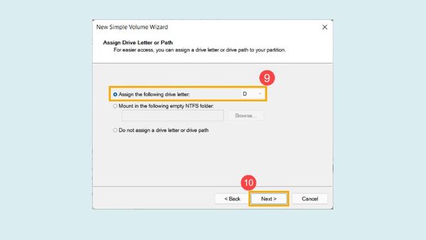 Bước 6: Chọn Assign the following drive letter, rồi chọn Next.