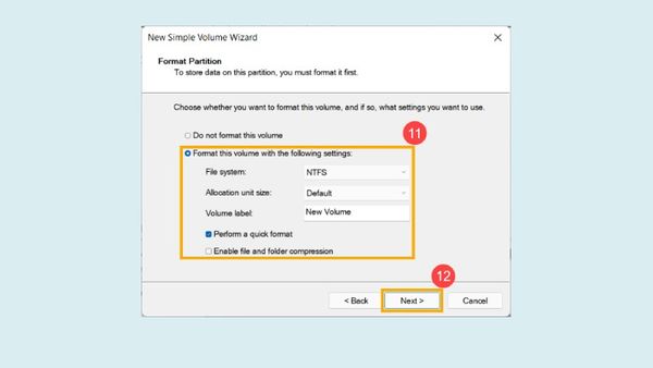 Bước 7: Để định dạng phần Volume với cài đặt mặc định, bạn có thể điều chỉnh Volume label, rồi chọn Next.