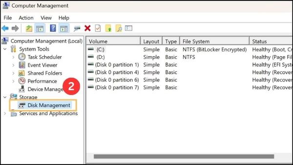 Bước 2: Tại cửa sổ trang Computer Management, chọn Disk Management.