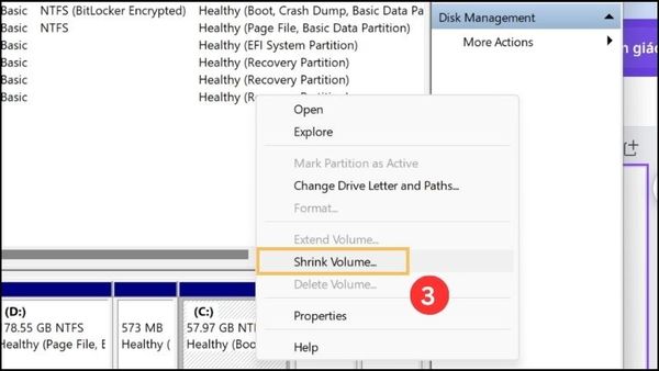 Đưa chuột vào ổ cứng cần chia rồi nhấn chuột phải, chọn Shrink Volume.