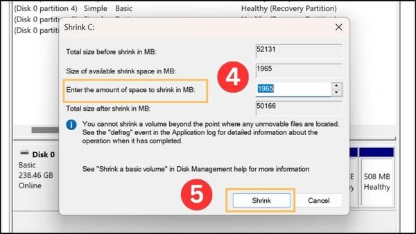 Nhập dung lượng ổ cứng cần chia vào rồi chọn Shrink