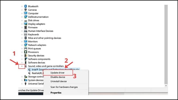 Bước 2: Click chuột vào mũi tên để mở tuỳ chọn mục Sound, Video and game controllers > Chọn Driver âm thanh cần update > Bấm chuột phải vào Update driver.