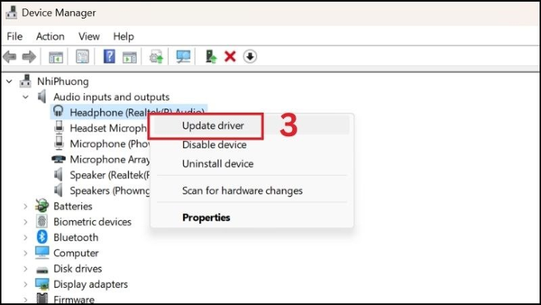 Chọn Driver âm thanh cần update > Bấm chuột phải vào Update driver
