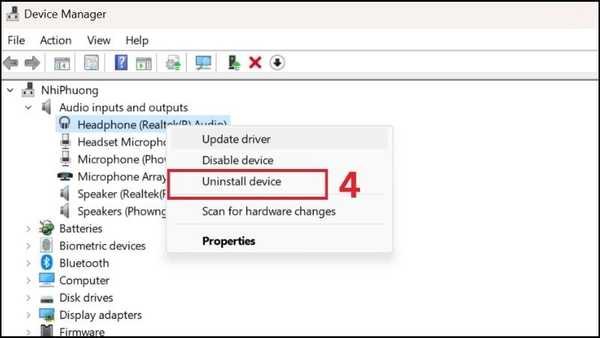 Nếu cập nhật xong mà máy vẫn bị mất tiếng thì bạn thao tác lại bước bấm chuột phải vào thiết bị gặp lỗi > Chọn Properties > Chọn Uninstall Device rồi xác nhận.