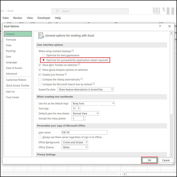 Việc tối ưu giao diện, hình ảnh,... trong Excel sẽ giúp ứng dụng này chạy nhanh, mượt hơn trên máy tính của bạn đó. Mở Excel > Chọn File > Options > General tiếp đó chọn vào Optimize for compatibility ở User Interface Options > Nhấn OK là xong rồi nè.