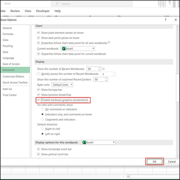 Tính năng đồ họa hardware cho phép ứng dụng dùng GPU và nâng cao hiệu suất làm việc. Tuy vậy, đôi lúc tính năng dẫn đến máy nóng nhanh lag, chậm. Vì vậy hãy tắt nó đi bằng cách Chọn File > Options > Advanced > Tìm đến Display > Tích vào Disable hardware graphics acceleration > Nhấn OK nha.