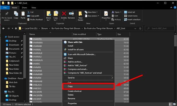 Bước 4: Mở từng file font chữ đã giải nén > Trên bàn phím ấn Ctrl + A để chọn toàn bộ font chữ > Bấm chuột phải chọn Copy để tiến hành sao chép.