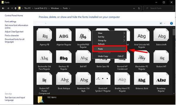 Bước 5: Nhấp vào This PC hoặc My Computer trên màn hình Desktop > Chọn tiếp vào đường dẫn C:WindowsFonts để vào file Font chữ > Nhấn chuột phải chọn Paste để thiết lập toàn bộ font chữ vào tệp Font.