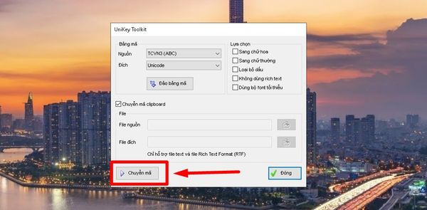 Bước 3: Cửa sổ Unikey Toolkit xuất hiện, ở mục Nguồn chọn font TVCN3 (ABC) và trong mục Đích chọn font Unicode.