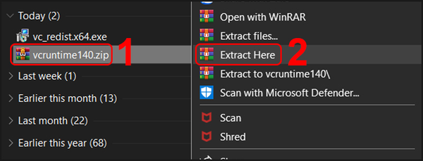 Bước 2: Bạn vào thư mục Downloads > Nhấn chuột phải vào thư mục vcruntime.zip > Chọn Extract files... để chọn nơi lưu hoặc nhấn vào Extract to vcruntime140\ lưu file giải nén tại thư mục Downloads.