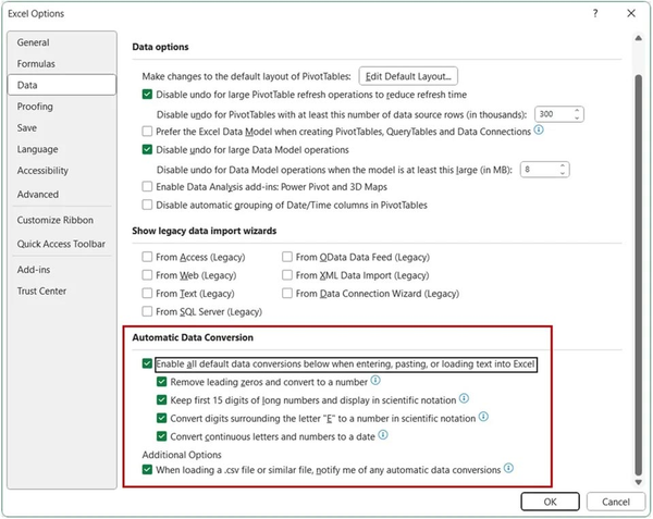 Chúng ta có thể bỏ chọn cài đặt Enable all default data conversions below when importing, pasting, or loading text into Excel để tắt tất cả định dạng tự động khi nhập dữ liệu vào nội dung.