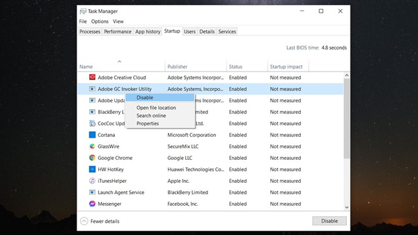 Sau đó, anh em chọn qua tab Startup, tìm kiếm ứng dụng mà anh em nghi ngờ gây ra lỗi và chọn Disable để vô hiệu hóa chúng không khởi động cùng Windows.