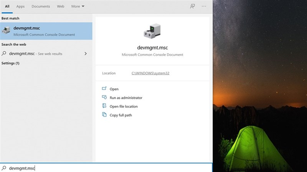 Cách 2: Nhập vào ô tìm kiếm của Windows đoạn lệnh sau devmgmt.msc. Chọn ứng dụng đầu hiện ra, cửa sổ quản lý các Driver là Device Manager sẽ hiện lên và anh em bắt đầu kiểm tra.