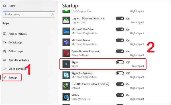 Chuyển sang tab Startup, chọn các ứng dụng không cần thiết (như phần mềm chat, trình nghe nhạc), và nhấn Disable.