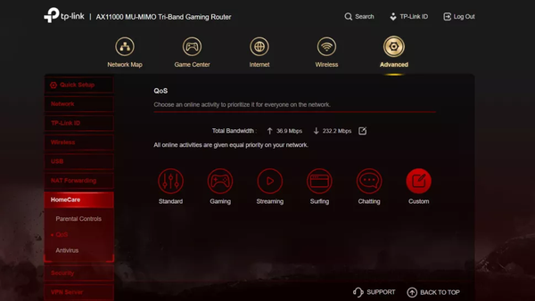 TP-Link AX11000 có thể được điều khiển bằng ứng dụng di động Tether của TP-Link hoặc bằng bảng điều khiển dựa trên web, nhưng bảng điều khiển web cung cấp nhiều quyền kiểm soát hơn so với ứng dụng dành cho thiết bị di động, bao gồm bảng điều khiển trung tâm trò chơi. Bảng điều khiển sẽ mở ra màn hình chính với các nút dọc theo bản đồ mạng, trung tâm trò chơi, Internet không dây và nâng cao. Ngoài ra còn có một bảng đồ mạng cho bạn biết được có bao nhiêu máy khách được kết nối. Bên dưới bản đồ hiển thị thông tin chi tiết về internet của bạn (địa chỉ IP, MAC, loại kết nối) và một bảng khác có đồng hồ đo Speedtest hiển thị tốc độ tải lên và tải xuống internet của bạn.