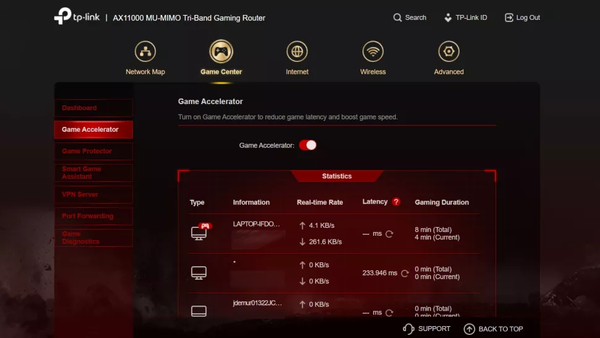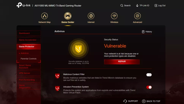 Ở bên trái màn hình là menu bao gồm tab cho Game Accelerator, Game Protector, Smart Game Assistant và Game Diagnostics. Tùy chọn Game Accelerator cho phép bạn giảm độ trễ và tăng tốc độ trò chơi tổng thể cho bất kì ứng dụng khách nào. Tùy chọn Game Protector là nơi để định cấu hình tính năng chống phần mềm độc hại và kiểm soát của phụ huynh HomeCare của TP-Link. Đây là các điều khiển tương tự được hỗ trợ bởi Trend Micro đi kèm với bộ định tuyến Archer AX6000 của TP-Link và cung cấp các bộ lọc trang web dành riêng cho từng độ tuổi và bảo vệ trọn đời chống lại sự xâm nhập của vi rút và các nội dung độc hại khác. Sử dụng Game Diagnostics để chạy kiểm tra Ping và theo dõi nhằm giúp xác định sự cố mạng. Các tùy chọn khác bao gồm cài đặt máy chủ VPN và chuyển tiếp cổng.