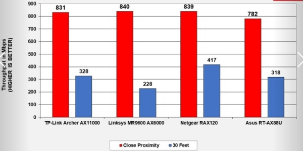 Hiệu suất trên băng tần 5GHz cũng khá ổn định. Kết quả của Archer AX11000 là 831Mb, nhanh hơn 6% so với RT-AX88U. Ở độ cao gần 10 mét, kết quả 328Mb/ giây của TP-Link AX11000 nhanh hơn MR9600 và RT-AX88U nhưng không thể bắt kịp RAX120, dẫn đầu với kết quả là 417 Mb/ giây.