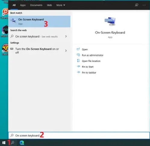 Bấm vào biểu tượng hoặc thanh công cụ tìm kiếm > nhập từ khóa “On screen keyboard” và chọn kết quả tương ứng.