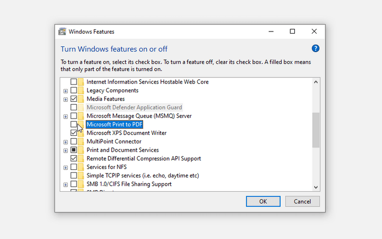 - Tiếp theo, mở lại Windows Feature > tích ô Microsoft Print to PDF > Click OK.