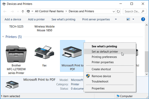 - Tiếp theo, tìm Microsoft Print to PDF, click chuột phải vào nó và chọn Set as default printer.