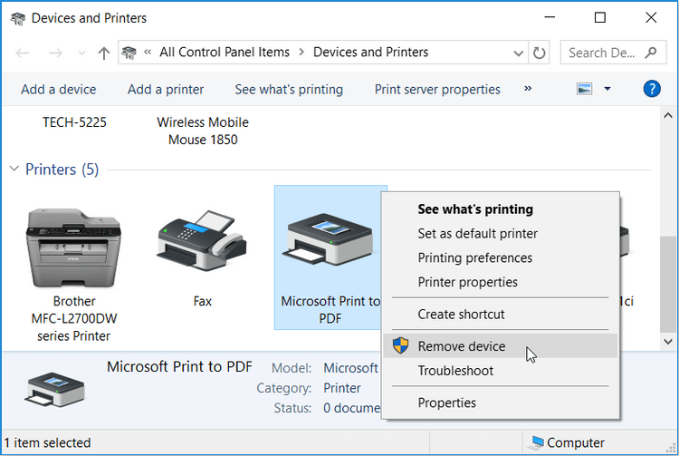 - Tiếp theo, click chuột phải vào Microsoft Print to PDF và chọn Remove device.
