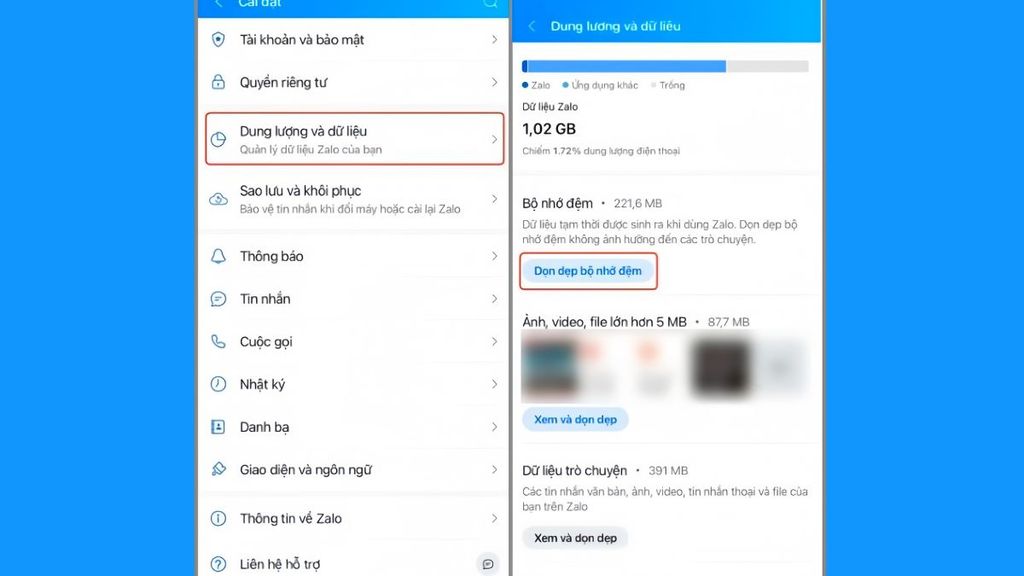Xóa cache của ứng dụng là một trong những cách sửa lỗi Zalo không gửi được ảnh hiệu quả. Dữ liệu cache lưu trữ lâu ngày có thể bị lỗi, gây ảnh hưởng đến hoạt động của ứng dụng. Để thực hiện, hãy vào Cài đặt trên ứng dụng , chọn Dung lượng và dữ liệu sau đó chọn Dọn dẹp bộ nhớ đệm. Với máy tính, bạn có thể đăng xuất và đăng nhập lại để làm mới dữ liệu tạm thời. Thao tác này giúp ứng dụng hoạt động mượt mà hơn.