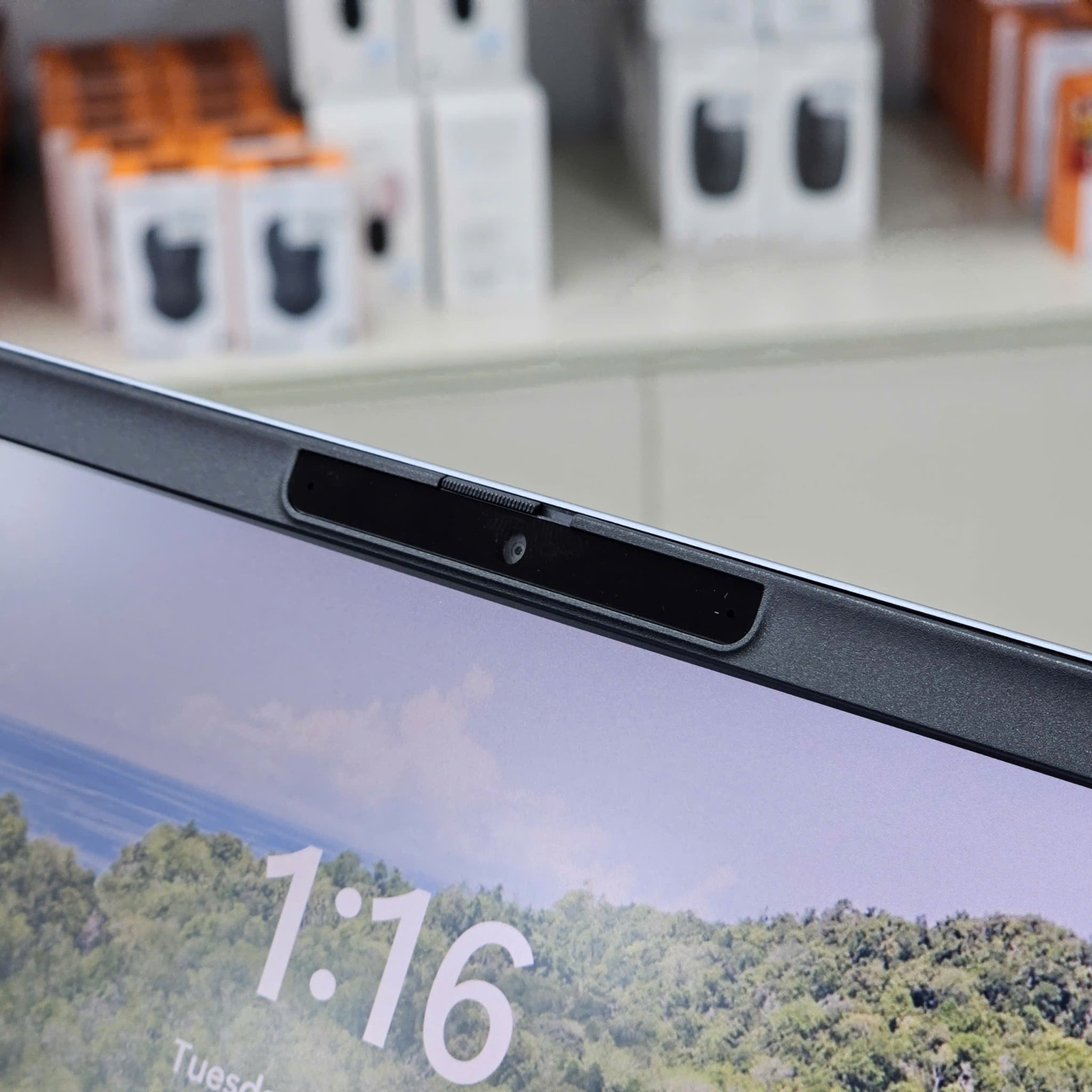 Màn trập riêng tư: Khóa camera vật lý giúp bạn hoàn toàn yên tâm về sự riêng tư khi không sử dụng.