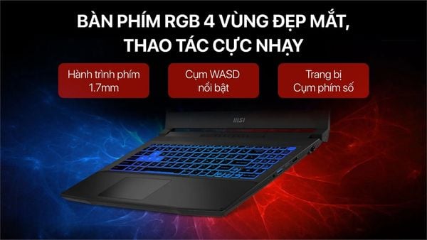 Bàn phím tiện lợi: 4-Zone RGB, hành trình phím 1.7mm, hỗ trợ nhập liệu nhanh và gaming chính xác.