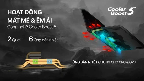 Cooler Boost 5: Hệ thống tản nhiệt với quạt đôi và 6 ống dẫn nhiệt giữ nhiệt độ CPU/GPU ổn định (~60-75°C khi chơi game nặng), đảm bảo hiệu suất lâu dài trong các trận chiến game hoặc render đồ họa
