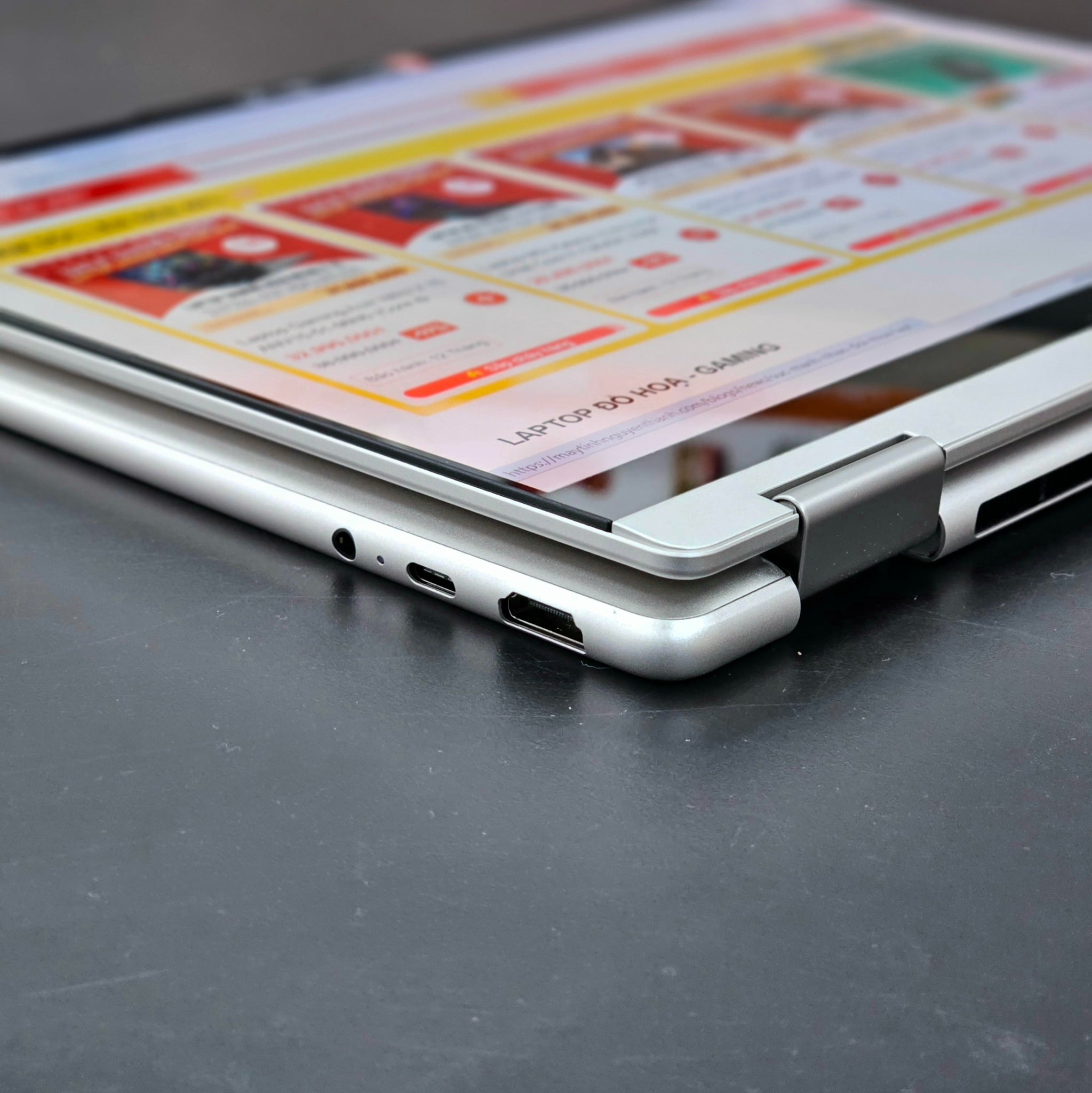 🔄 Xoay gập 360 độ linh hoạt: Bản lề kép bền bỉ cho phép chuyển đổi mượt mà giữa 4 chế độ: Laptop, Tablet, Lều (Tent) và Trình chiếu (Stand).