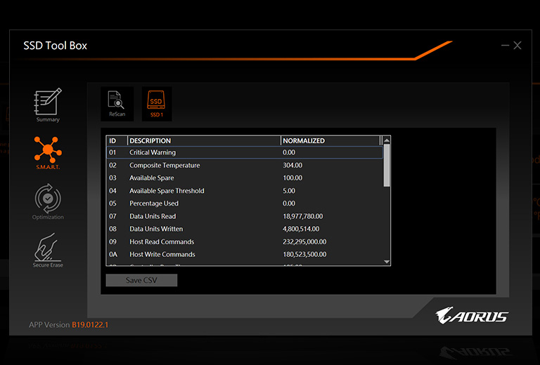 ![]() | SSD Tool Box SSD Tool Box là ứng dụng giúp người dùng theo dõi SSD Status, cung cấp thông tin chung như tên model, phiên bản FW, tình trạng sức khỏe, tối ưu hóa ổ đĩa và cũng phát hiện nhiệt độ thông qua các cảm biến. Hơn nữa, người dùng có thể xóa tất cả dữ liệu với chức năng Secure Erase. Bạn có thể tải xuống từ trang chủ của Gigabyte. |